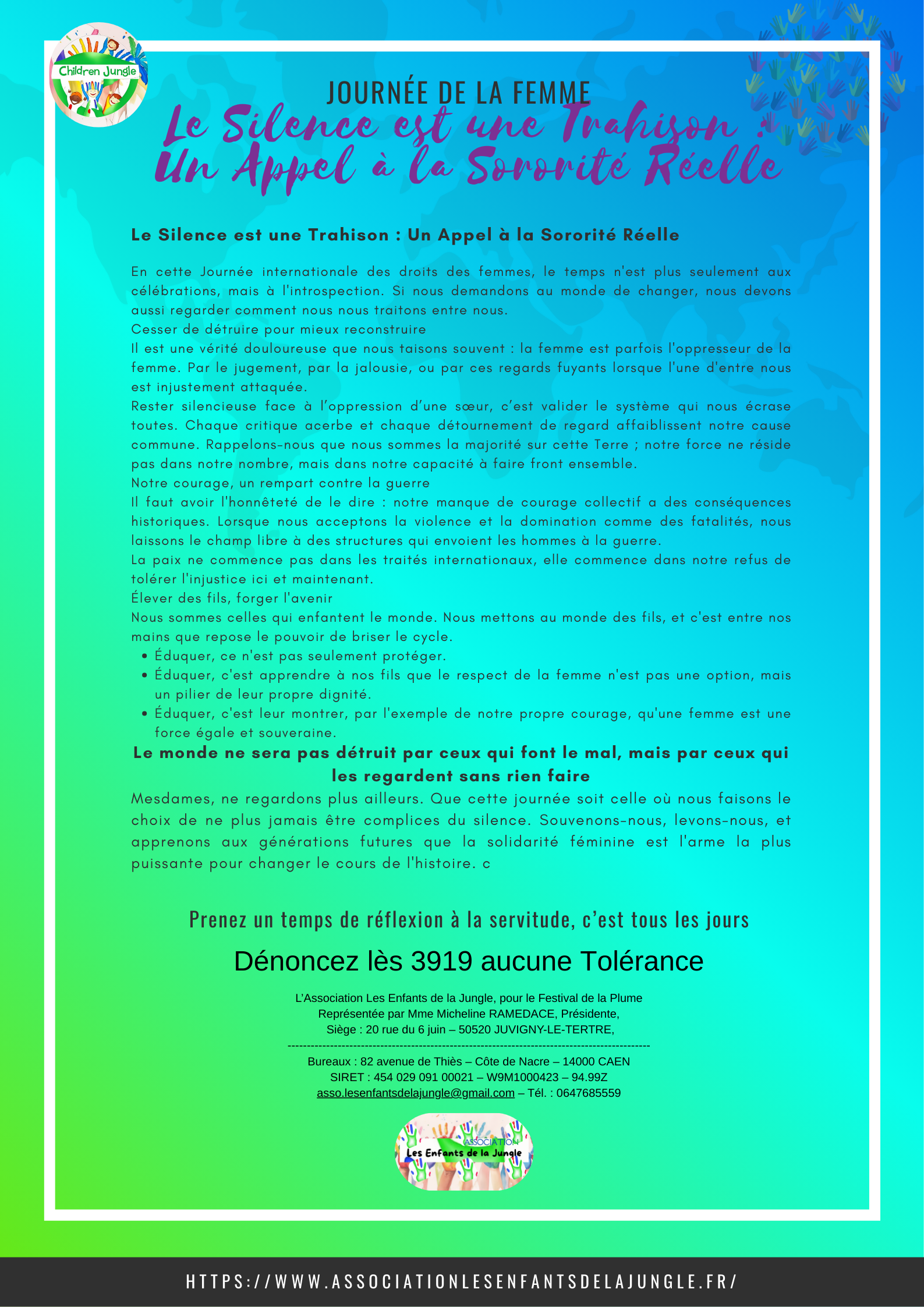 Ou contacter notre médiateur anonyme référent, par écrit ou téléphone : mediation.anonyme.assoledljungle@gmail.com